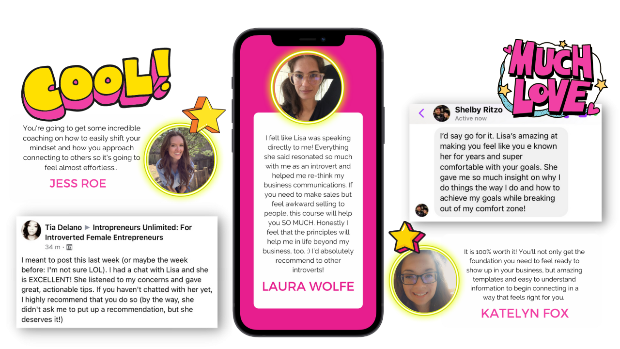Learn and apply your own unique mix of strategies that are tailor-made for introverts, so that your business feels effortless and aligned. (NO cookie-cutter, 10-step programs here!)