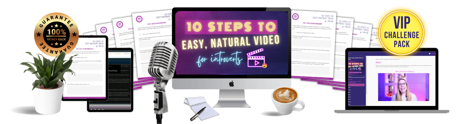 10 Steps to Easy Natural Video for Introverts is the original step-by-step gentle challenge designed to take you gradually from cringing at the thought of showing up on camera to being able to quickly, confidently hit record and teach on screen with ease.