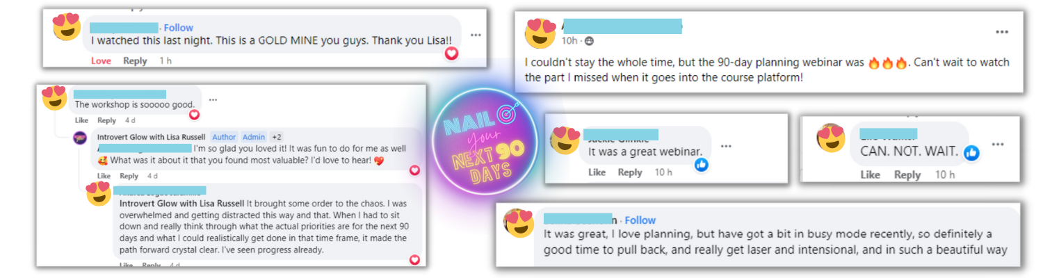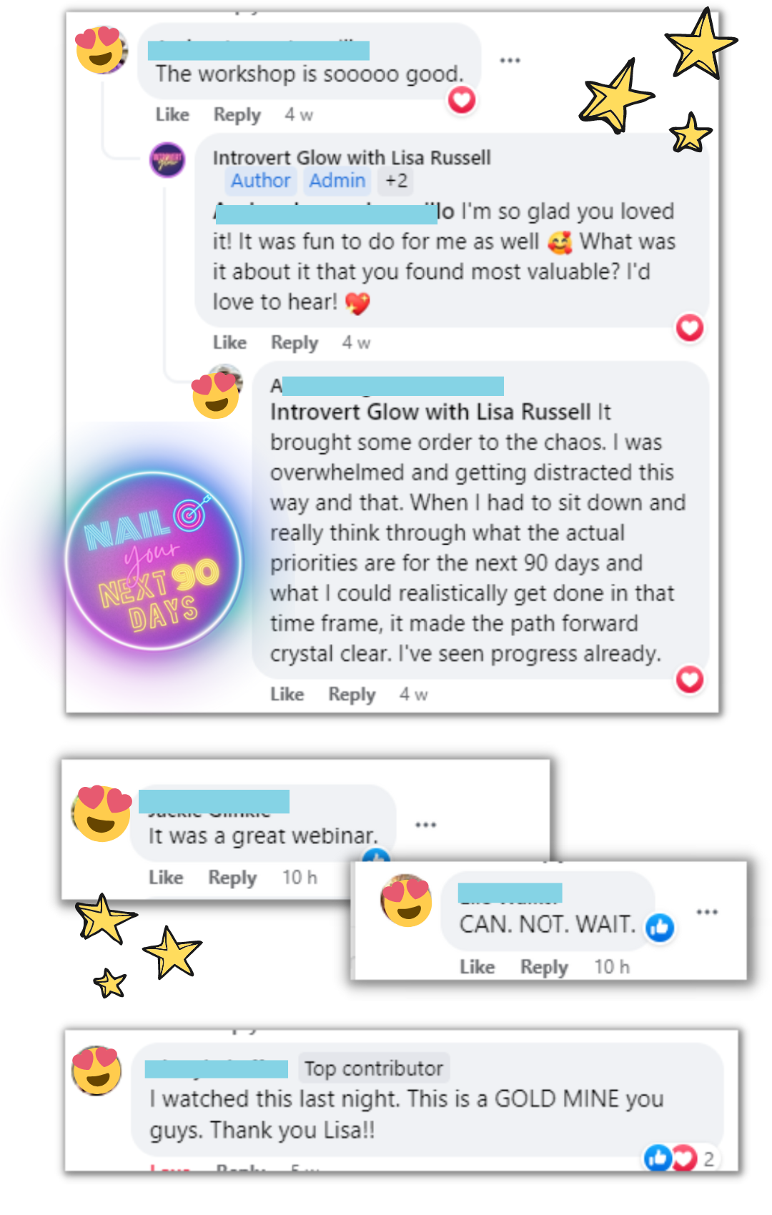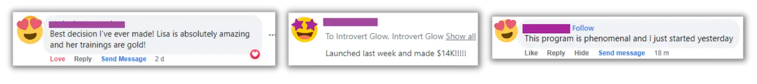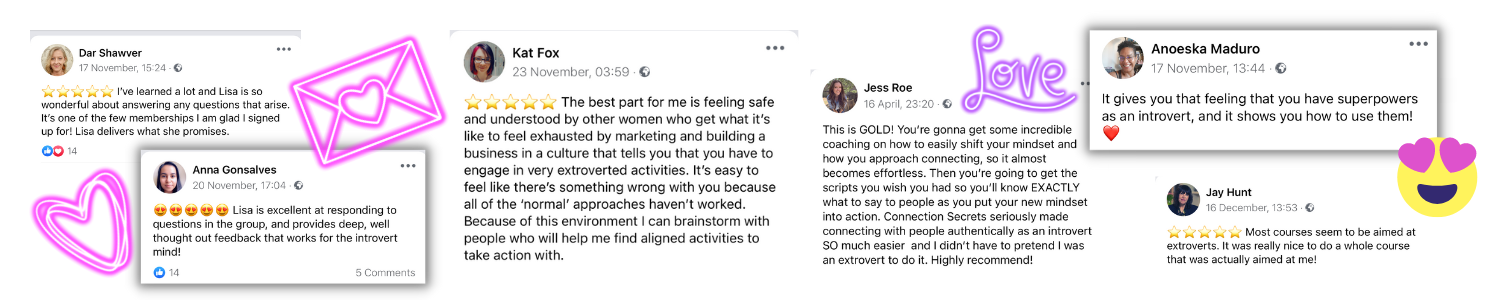 In our private, members-only community you can get your questions answered within 24 hours (excluding weekends and holidays). You can request feedback and eyes on your stuff anytime you like. There will also be special additional trainings and new resources added to your training portal monthly. If you need customer support, e.g. for help with billing and access queries, you can reach out anytime to hello@introvertglow.com and either Lisa or a member of my team will come back to you asap.