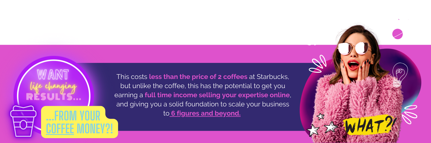 This costs less than the price of 2 coffees at Starbucks, but unlike the coffee, this has the potential to get you earning a full time income selling your expertise online, and giving you a solid foundation to scale your business to 6 figures and beyond.